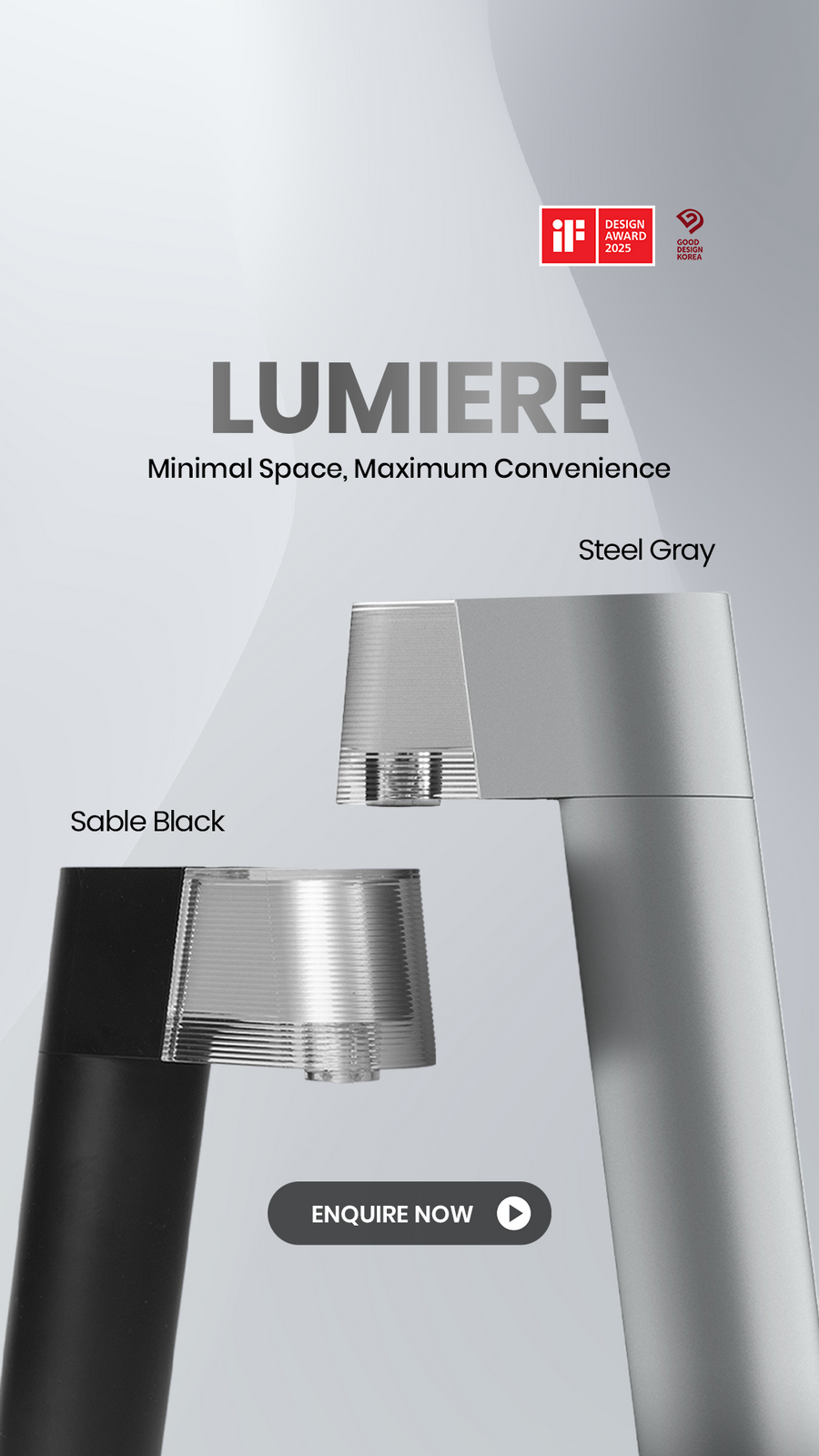 LUMIERE by Livingcare is a sleek under-sink water purifier designed for modern homes. It features a multi-functional faucet that dispenses hot, cold, and ambient water with adjustable volume control.
